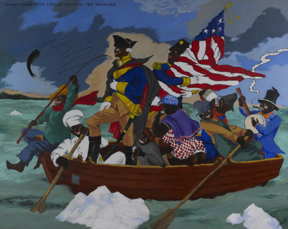 George Washington Carver Crossing the Delaware: Page from an American History Textbook, 1975. Acrylic on canvas, 78 1/2 × 98 1/4 in. (199.4 × 249.6 cm). Lucas Museum of Narrative Art, Los Angeles, 2021.45.1. © 2022 The Robert H. Colescott Separate Property Trust / Artists Rights Society (ARS), New York.