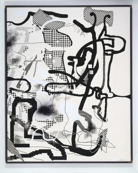 Albert Oehlen, Der vergiftete Asket [The Poisoned Ascetic], 1992. Silkscreen and acrylic on paper, 79 × 63 3/8 in (200.5 × 161 cm). Private collection. Image courtesy the artist and Luhring Augustine, New York