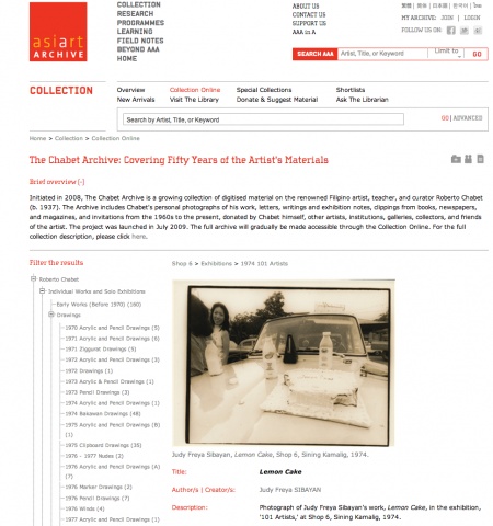 Browsing through the archive reveals a playful yet complex practice that addresses the urgencies of the day, while providing a foundation for artistic and intellectual endeavors in the present. Most immediately resonant with the New Museum’s Museum as Hub initiative are the Shop 6 materials. The storefront space in Sining Kamalig was opened by Chabet with a group of artists that included Yolanda Laudico, Boy Perez, Joe Bautista, Fernando Modesto, Rodolfo Gan, and Joy Dayrit. Together, they organized one group or solo exhibition per week for roughly fourteen weeks, creating a space for conceptual modes of expressivity and criticality that stood in contrast to more formal, medium-specific practices championed at the time. An article in the arts publication Marks observed: “To cynics, Shop 6 is just another showcase for pakulo, a place for gimmicks or simply ‘rubbish.’ But judging from the one-man exhibitions, gimmickry was hardly a concern: the works were results of hard work perhaps, harder thinking.” 1 The exhibition “101 Artists,” one of Shop 6’s last shows, is exemplary of the art space’s ambitions. Here, organizing members invited other artists to present works alongside their own, mounting a massive exhibition that filled the space and extended into a nearby parking lot. Artist Judy Freya Sibayan’s Lemon Cake (described in the above article and accessible from the archive) invited artists to pile into a car and consume food and drink. Sibayan’s playful, participatory act not only takes art-making beyond proper institutions of art but also bears political dimension amidst the backdrop of Philippine martial law imposed two years earlier by President Ferdinand Marcos in 1972. The Archive’s annotations also point out that the launch of Shop 6 follows the artist’s resignation as Museum Director of the Cultural Center of the Philippines (CCP), which was built at the behest of infamous First Lady Imelda Marcos. Chabet recalled: “I was being alienated already by CCP at the time… I felt that maybe they should have an alternative to the alternative.” 2 In retrospect, we can see how Shop 6 became a catalyst for activity on the ground and provided a precedent for the development of similar artist-driven activity in the Philippines today.