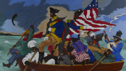 George Washington Carver Crossing the Delaware: Page from an American History Textbook, 1975. Acrylic on canvas, 78 1/2 × 98 1/4 in. (199.4 × 249.6 cm). Lucas Museum of Narrative Art, Los Angeles, 2021.45.1. © 2022 The Robert H. Colescott Separate Property Trust / Artists Rights Society (ARS), New York.