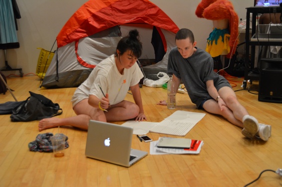 “AUNTSforcamera” Production Week: Open Studios (September 10–14, 2014). Photo: Travis Chamberlain. Pictured: Gillian Walsh and Mickey Mahar in production for Archiving working at AUNTS at the New Museum