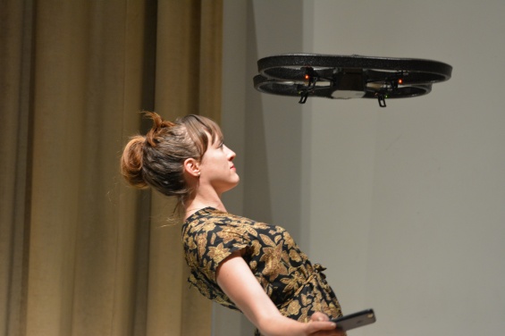 “AUNTSforcamera” Production Week: Open Studios (September 10–14, 2014). Photo: Travis Chamberlain. Pictured: Cara Francis dances with a drone in production for her work REMOTE