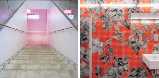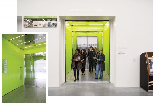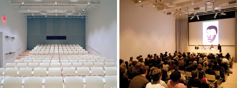 Descending by either the open, glass-enclosed interior stairway or an elevator to the building’s lower level, visitors will find a 182-seat “white box” theater/auditorium and a pre-function hall that doubles as a gallery for special projects and installations. This floor also houses the Museum’s restrooms (where Bisazza tile super-graphics cover walls with hotly hued, pixilated hanimi cherry blossom patterns—the only intensely colored feature in the building aside from the vibrant green elevator cab interiors); backstage support, storage, and green room areas for the theater; general storage; and mechanical support.
