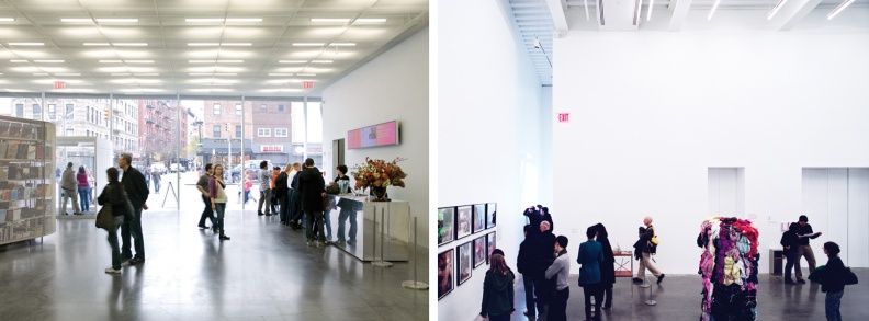 Gray concrete sidewalk outside gives way to polished gray concrete floors in the grand but intimate Marcia Tucker Hall. This space contains the Visitor Services desk, ticketing desk, Coat Check, the New Museum Store (demarcated by a serpentine screen of metal mesh), the New Museum café and its open kitchen, the stairway down to the building’s lower level and Theater, elevator banks for access to the galleries above, and a luminous 1,100-square-foot gallery separated from the rest of the space by a soaring glass wall and illuminated by daylight filtering down from the shift of the structural box above. A floating dropped screen of metal mesh softens and abstracts the largely visible functions of the ceiling above it, filtering light from a grid of glowing, petite florescent tubes.
