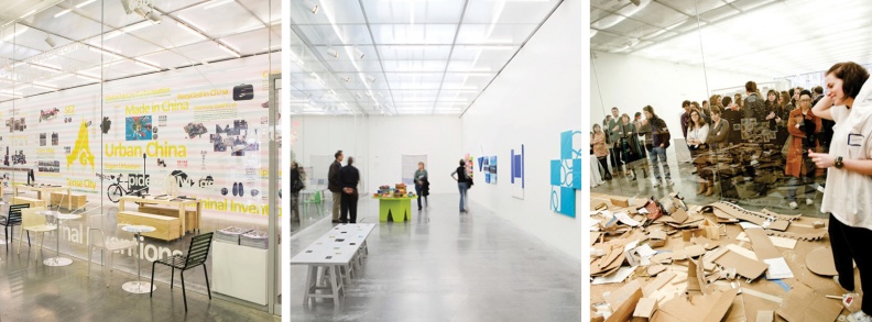 Installation views from the Lobby Gallery. From the far left: “The Three M Project: New Commissions: Urban China: Informal Cities” (2009); “Mary Heilmann: To Be Someone” (2008–09); and “The Generational: Younger Than Jesus” (2009)