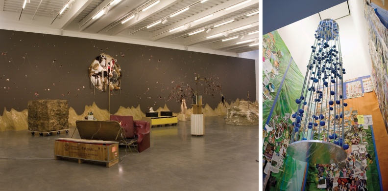 Left: “Unmonumental” (2007–08) installed in the Third Floor gallery; Right: “Agathe Snow: Master Bait Me” (2009) installed in the Shaft Space