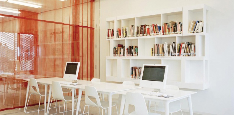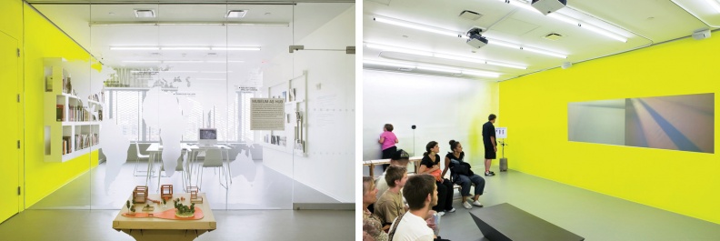 The outer structural columns become increasingly exposed above the fourth floor in the less public levels of the building. The Fifth Floor houses the institution’s education center, with classroom spaces, a Resource Center, a space for the institution’s revolutionary Museum As Hub intra-institutional outreach program, and a video editing room. On the sixth floor are the staff offices, staff kitchen, restrooms, and meeting spaces. Here, operable windows wrap the space on two sides and sliding polycarbonate panels provide privacy.