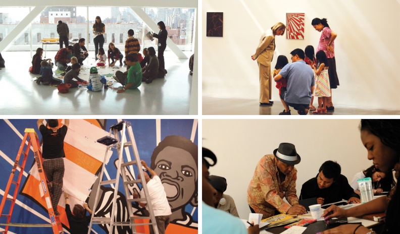 Top: First Saturdays for Families offers free, hands-on programming for families with children every month. Bottom: Artists Emory Douglas and Rigo 23 paint a mural as part of the exhibition “Emory Douglas: Black Panther” (2009). Later, high school students work with Douglas to plan and execute a community mural