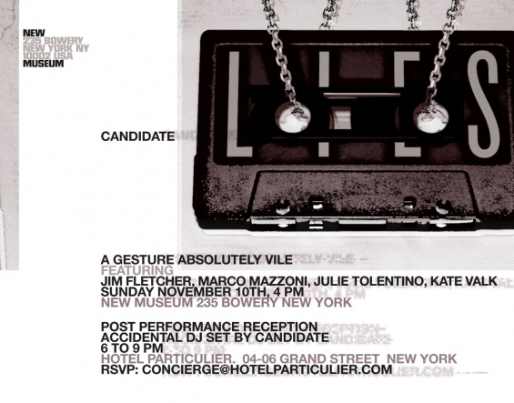 An ongoing collaboration between Lovett/Codagnone and musician Michele Pauli (of Italian band Casino Royale), CANDIDATE produces extreme electro-industrial dance music and noise to accompany many of Lovett/Codagnone’s visual artworks. Their live shows often incorporate performances by major figures of experimental theater and film. This concert, entitled A Gesture Absolutely Vile, features special appearances by actor and member of the New York City Players Jim Fletcher, dancer and Kinkaleri company member Marco Mazzoni, actor and founding member of Wooster Group Kate Valk, and artist and performer Julie Tolentino. An installation by Lovett/Codagnone coyly subverts traditional power dynamics between audience and performers, providing a stark atmospheric environment for the event.