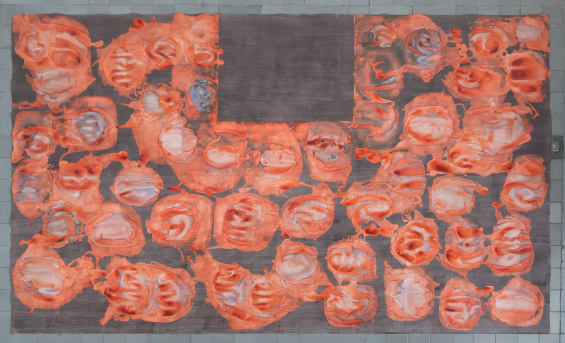 Carmen Argote, Patio con Citrus / Patio with Citrus, 2019. Cochineal and lemon on watercolor paper, 197 × 116 in (500 × 294 cm). Courtesy the artist and Commonwealth and Council, Los Angeles