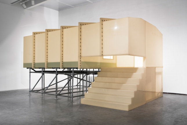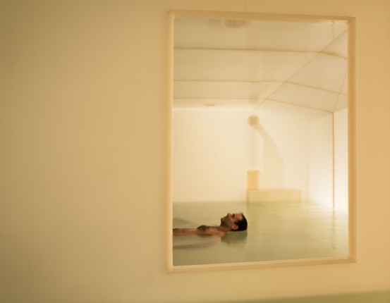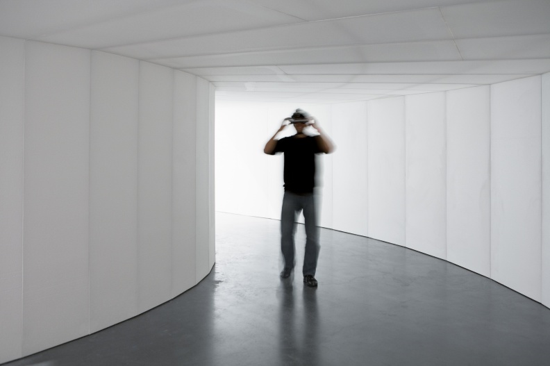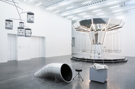 Each floor of the exhibition explores a different general theme within Höller’s work to provide a carefully choreographed journey through the building and the artist’s oeuvre. The fourth floor focuses on the theme of movement—featuring the artist’s spectacular Mirror Carousel (2005), which provides riders with a notably different physical experience than the traditional fairground merry-go-round, while at the same time reflecting and illuminating the space surrounding it. The third floor gathers together works that seek to provide an altered or utopian experience of architectural space. For example, his Giant Psycho Tank (2000) invites viewers to float weightlessly in the water of a sensory deprivation pool, providing a tenebrous, out-of-body experience.