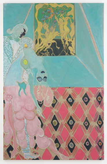 Chris Ofili, Ovid-Desire, 2011–12. Oil, pastel, and charcoal on linen, 122 1/8 × 78 3/4 in (310 × 200 cm). Courtesy the artist, David Zwirner, New York/London, and Victoria Miro Gallery, London