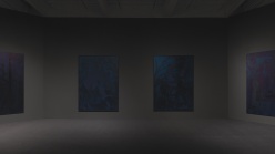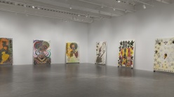 Ofili’s early paintings from the ’90s were created using his signature layering of materials, including paint, resin, glitter, and elephant dung, a material he first collected during an art study trip to Zimbabwe in 1992. The exhibition brings together twelve of his canvases from this period, which combine spectacularly rendered psychedelic surfaces with provocative imagery from a staggering array of cultural sources and assemble a cast of characters including religious figures, political and cultural icons from across history, and imaginary heroes. From this early period, Ofili established an approach to painting that is both seductive and rigorously historical. After moving to Trinidad from London in 2005, Ofili’s work took a new direction with the “The Blue Rider” series, which takes its name from the early twentieth-century artist group that sought spirituality by connecting visual art with music. Since then, Ofili has gone on to create a number of large blue paintings. For this exhibition, nine of these works are brought together for the first time in an architectural environment designed by the artist. Composed in dark hues of blue, this series of paintings evokes the blue light of twilight and the soulfulness of blues music. Although rooted in the landscape and culture of Trinidad, Ofili’s blue paintings extend beyond to offer a contemplative approach to history, identity, and ways of seeing.