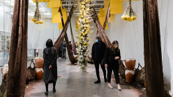 Since 2010, Lie has been using organic materials to create largescale pieces that simultaneously grow and decay. Unnamed Entities (2022), a new commission created specifically for the Museum’s Lobby Gallery, incorporates traditional terracotta ceramic vases, jute hemp fabric, natural fiber ropes, straw hay bales, mud with spores and seeds, and thousands of cut flowers. These materials will evolve and transmutate throughout the exhibition as they rot, mold, sprout, and change shapes and hues in unpredictable ways. Lie understands their works to be living entities endowed with awareness and agency, and considers the process of rotting as a way to complicate the binary opposition between life and death.