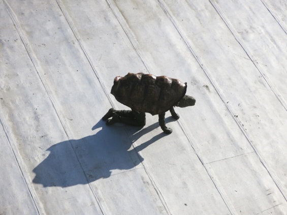 Titled Timeless Alex (2015), Eduardo Navarro’s newly commissioned work for the 2015 Triennial: “Surround Audience” departs from the conditions of experience determined by the human body to consider the phenomenological position of the turtle. The artist became intrigued by turtles’ perception of time—accentuated by the case of Lonesome George, the last living Pinta Island tortoise discovered in the Galápagos in 1971—and how self-awareness of their own longevity might affect cognition. The work is informed by the writings of Temple Grandin, a writer and autism activist who posited that animals think in pictures and understand life through constant sensorial stimulation generated by shadows, sounds, and colors. Without the ability to form language-dependent abstract concepts about these sensations, animals move through the world without a concept of time. In the exhibition, a sculptural model of a Galápagos tortoise is featured alongside a leather skin and face mask. At this two-hour event, the artist will activate the turtle by donning the sculpture and moving at slow speeds, meditating inside the shell in an attempt to move slower than language and reach a timeless state of mind.