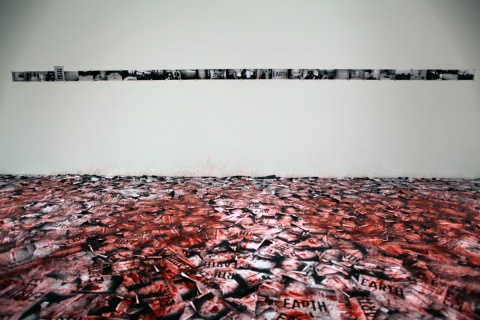 Les Levine, Systems Burn-off × Residual Software, 1969/2012. 1,000 copies each of thirty-one photographs (taken at the March 1969 opening of “Earth Art,” Andrew Dickson White Museum of Art, Cornell University, Ithaca, New York), Jell-O, and chewing gum. Recreated for “Ends of the Earth: Land Art to 1974” at the Museum of Contemporary Art, Los Angeles, 2012. Dimensions variable. Courtesy the artist