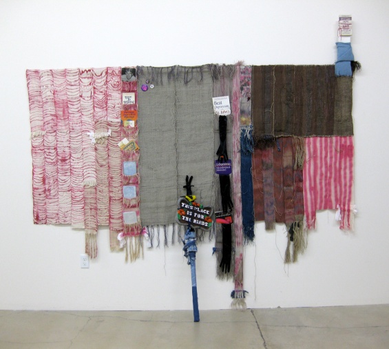 Josh Faught, Triage, 2009. Handwoven hemp, nail polish, spray paint, indigo, logwood, toilet paper, greeting cards, gay pride pins, self-help books, plaster, yarn, handmade wooden sign by a man from the Oregon coast who died shortly after fabricating it, denim, and gloves, 120 × 80 in (304.8 × 203.2 cm). Courtesy the artist. Photo: Mike Bray