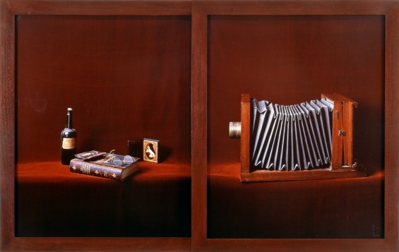 Still Life with Camera, from the “Doubleworld” series, 1995. Two Cibachrome prints with mahogany frame, diptych, 51 × 81 in (129.5 × 205.7 cm). Courtesy the Estate of Sarah Charlesworth and Maccarone Gallery, New York