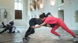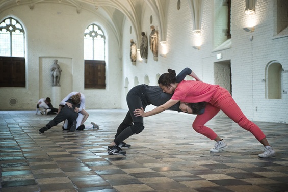 Cally Spooner, On False Tears and Outsourcing – dancers responsible for delivering self-organized efforts to resolve difficult and time-consuming issues “go the distance” across multiple overlapping phases using appropriated competitive strategies and appropriated intimate gestures, 2015. Installation view: Vleeshal Markt, Middelburg, the Netherlands. Courtesy Vleeshal Markt, Middelburg, the Netherlands. Photo: Anda van Riet