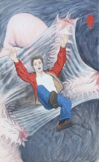 Jim Shaw, Dream Object: Paperback Cover (“I saw a guy falling into a giant membranous, disgusting throat or other orifice.”), 2008. Gouache on rag board mounted on plywood, 10 ½ x 6 ¼ in (26.7 × 15.9 cm). Courtesy Galleria Massimo De Carlo, Milan/London