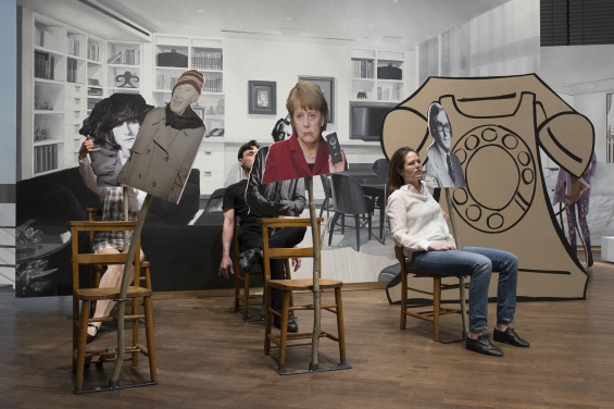 Macuga’s hour-long play, which premiered at the 8th Berlin Biennial for Contemporary Art in May 2014, draws connections between Warburg’s writing on the rites of indigenous cultures—in particular Native-American serpent rituals such as the Hopi people’s Snake Dance—and the performative roles that contemporary art–goers assume when attending international exhibitions and fairs. In Macuga’s play, a pair of actors take turns portraying Warburg, while two acrobats and two actresses adopt a variety of guises including a flying carpet; a pair of writhing snakes; performance artist Marina Abramović; Russian oligarch Roman Abramovich; and Dr. Ludwig Binswanger, the psychiatrist who diagnosed Warburg with mental illness. Other characters in the play, including Chancellor of Germany Angela Merkel, artists Richard Artschwager and Andrea Fraser, and Macuga and Roelstraete themselves, are represented by cardboard cutouts mounted on branches and posed in front of hand-painted backdrops that are based on photographs of the homes of MCA trustees and collectors. Preparatory Notes connects to Macuga’s tapestries as disparate figures and narratives are woven together through the enactment of the play.