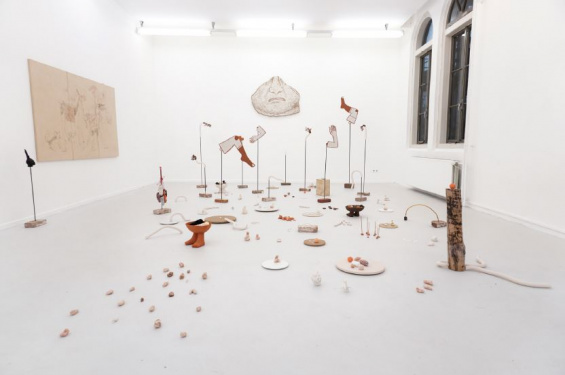 Claudia Martínez Garay, ... imaywanpas quidakuwakmi … / ... but you can stay with my stuff …, 2017. Installation with ceramic and paintings, dimensions variable. Courtesy the artist and GRIMM Gallery, New York