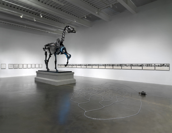 For six decades, Haacke has been a pioneer in kinetic art, environmental art, Conceptual art, and institutional critique. This retrospective brings together more than thirty works from across the artist’s career, focusing in particular on the way he expanded the parameters of his practice to encompass the social, political, and economic structures in which art is produced, circulated, and displayed. The exhibition includes a number of Haacke’s rarely seen kinetic works, environmental sculptures, and visitor polls of the late 1960s and early ’70s, all of which were central to discussions around systems aesthetics in art during that period; works from the 1970s and ’80s addressing the corporate sponsorship of major art institutions and political interference; and more recent works considering the intersection of global capitalism, nationalism, and humanitarian crises around the world. The exhibition also serves as the New York premiere of Haacke’s sculpture Gift Horse (2014), a bronze sculpture of a horse’s skeleton adorned with an LED ribbon streaming stock prices in real time, which the artist originally created for London’s Fourth Plinth program. This long-overdue assessment of his work highlights its formal and critical complexity and the remarkable consistency with which he has approached the relationship between art and society.