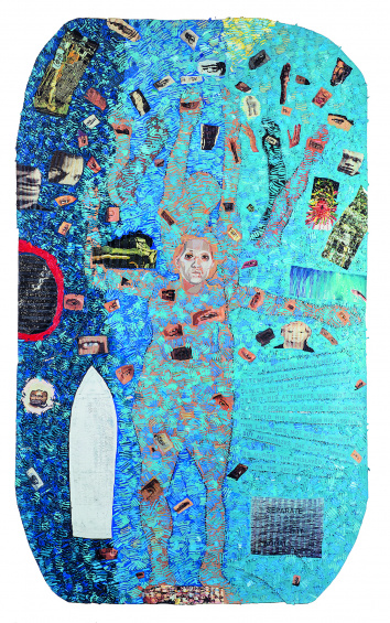 Howardena Pindell, Autobiography: Water (Ancestors/Middle Passage/Family Ghosts), 1988. Acrylic and mixed mediums on canvas 118 × 71 in. (299.7 × 180.3 cm). Wadsworth Atheneum Museum of Art, Hartford, CT. The Ella Gallup Sumner and Mary Catlin Sumner Collection Fund, 1989.17.