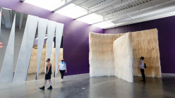 Installed in the New Museum’s Fourth Floor gallery, the exhibition debuts a new body of work that bridges historical research with a site-specific spatial intervention. Invoking both the use of police floodlights in targeted urban areas and the early eighteenth-century New York legal codes known as “lantern laws”—ordinances that required all enslaved individuals over the age of fourteen to carry lanterns or lit candles after dark—Kiwanga’s installation continues the artist’s investigation into disciplinary architectures and complex regimes of visibility. Weaving together different layers of opacity and transparency through textile and sculpture, Off-Grid subverts the application of artificial light as a means of control. Instead, the installation is solely illuminated with shifting patterns of natural light. Disconnected from the electric lighting system, the exhibition also stages a type of speculative scenario, evoking both the sudden closure of cultural institutions during the COVID-19 pandemic and a not-so-distant future when museums and society will have to operate with limited access to power.