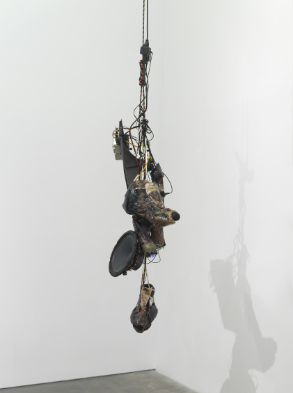 Kevin Beasley (b. 1985, Lynchburg, VA) lives and works in New York. Beasley’s practice traverses sculpture, photography, sound, and performance while sourcing materials of cultural and personal significance. From raw cotton harvested in Virginia, to textured sounds gathered from contact microphones, Beasley’s sculptural materials are altered, manipulated, cast, and molded to form a body of wall-based, freestanding, and sonic sculptures that acknowledge the complex, shared histories of the broader American experience steeped in generational memories. His work Strange Fruit (Pair 1) (2015), currently on view in “Grief and Grievance,” consists of a transformed pair of Air Jordan sneakers embedded with audio equipment that warps and amplifies the ambient tones of its surroundings.