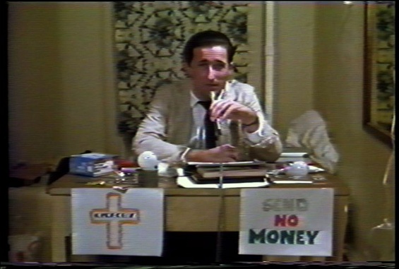 Milly Iatrou and Ron Morgan, The Very Reverend Deacon b. Peachy, Part One: A Minor Retrospection, 1982 (still). Sound, color, 28 min. Ron Morgan as The Very Reverend Deacon b. Peachy. Made for Communications Update, a.k.a. Cast Iron TV, a weekly artist-run television series that ran on Manhattan Cable TV public access Channel D from 1979 through 1992