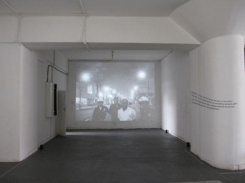 Tony Cokes, Black Celebration, 1988. Video, black and white, sound; 17 min. Installation view: Center for Historical Reenactments, Johannesburg. Courtesy Center for Historical Reenactments. Photo: Ryan Inouye