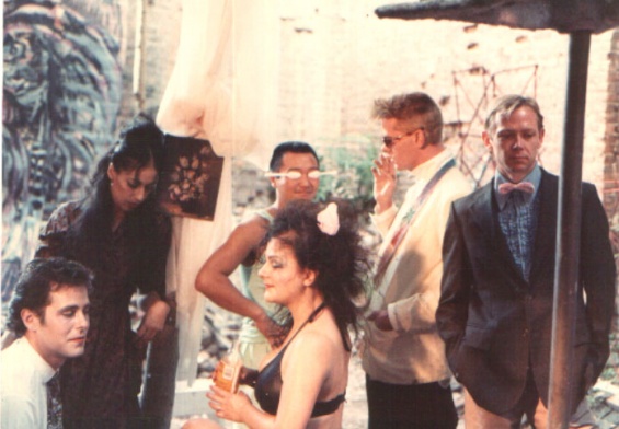 Jack Waters, Brains by Revlon, 1986 (still). Sound, color, 18 min. Background performers in the restaurant set, staged in the backyard at ABC No Rio. Left to right: Richard Hofmann, Adrian Saich, Samoa, Valerie Caris, Gordon Kurtti, Brad Taylor. Courtesy Jack Waters and Allied Productions, Inc.