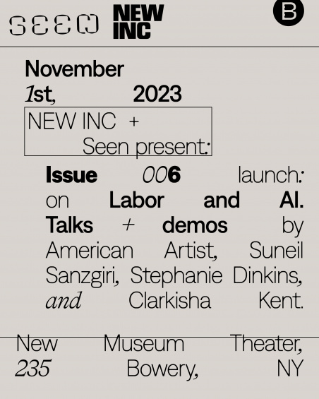 NEW INC and Seen journal are proud to celebrate the launch of Seen’s sixth issue at the New Museum. Join us for an event that will examine the dovetailing shifts rippling across art, film, and media: the rapid development of artificial intelligence (AI) and the twin strikes by the Writers Guild of America (WGA) and the Screen Actors Guild–American Federation of Television and Radio Artists (SAG-AFTRA). Together, these developments raise crucial questions about the future of creative labor and its conditions. Beneath the noise and doomsday predictions dominating narratives about AI and the strikes, however, lies a glimpse into the next phase of policy-making, industry standards, and media aesthetics. Building upon a featured article by writer and critic Clarkisha Kent, this program broaches this moment as a threshold of a future that is yet to be defined. Through lightning talks and discussions, guests American Artist, Stephanie Dinkins, and Suneil Sanzgiri will reflect on emerging technologies, equity, and the kind of era they want to be working in and through. Discussions will be moderated by Clarkisha Kent.