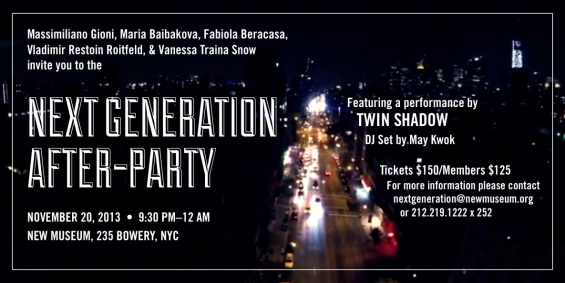 One of the fall season’s most anticipated downtown events, the New Museum’s signature Next Generation Party brings together top emerging tastemakers and influencers in art, design, fashion, and media to benefit the Museum’s special projects and programs. For event and ticket information, contact 212.219.1222 ×252 or nextgeneration@newmuseum.org.