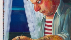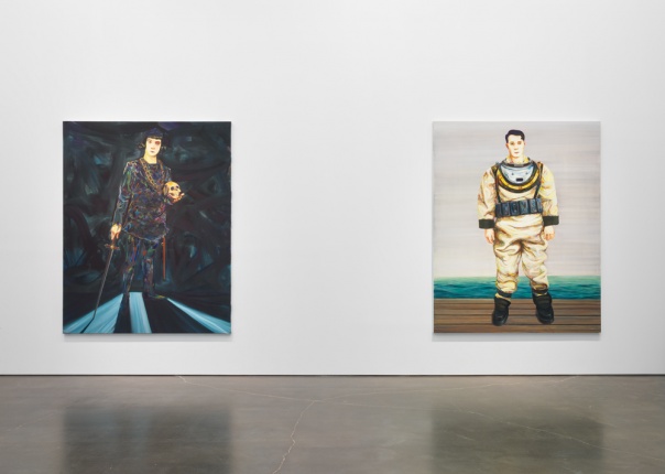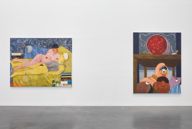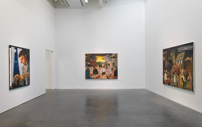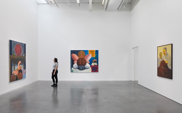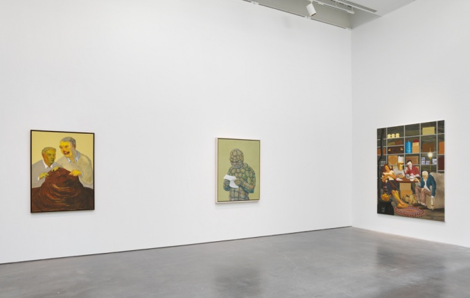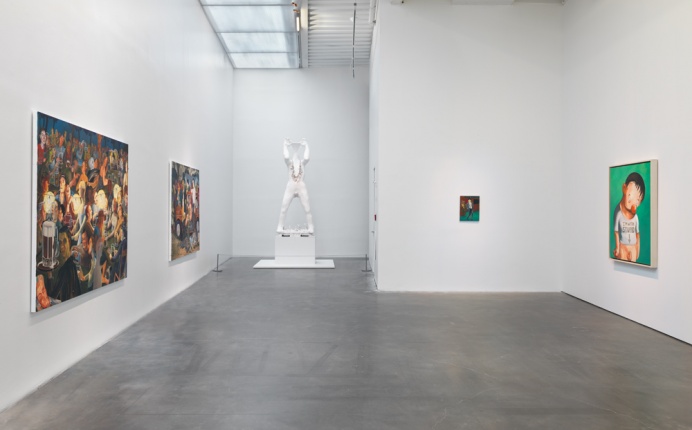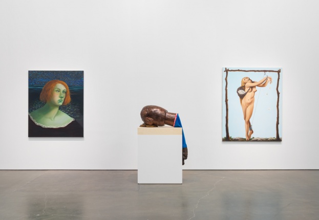 From the outset of her career, Eisenman’s investment in painting has led to frequent experimentation in other mediums, and her practice is characterized by visible shifts that mark her effort never to become too comfortable with any one approach to painting. Eisenman’s preoccupation with the figure and the complexity of its gestures and form has resulted in mesmerizing portraits of an array of characters who range from friends and fellow New Yorkers, to imagined heroines, to tragic losers. From Success to Obscurity (2004) depicts a monstrous superhero contemplating the contents of a letter it holds in its hands and alludes, perhaps, to the fragility of fame and fortune. In Hamlet (2007), a depiction of Shakespeare’s beautiful and frail Danish prince with lowered sword, Eisenman ponders the possibility of a sensitive and cautious leader at a time when the US was in the final year of George W. Bush’s presidency. Similarly inspired by contemporary events, the large group portrait The Triumph of Poverty (2009), painted in the aftermath of the 2008 financial crisis, is a reimagining of a lost sixteenth-century painting of the same title by Hans Holbein. “Nicole Eisenman: Al-ugh-ories” also includes one of the artist’s large-scale plaster figures, which she began producing in recent years, and two new oversize wax heads made specifically for this exhibition.