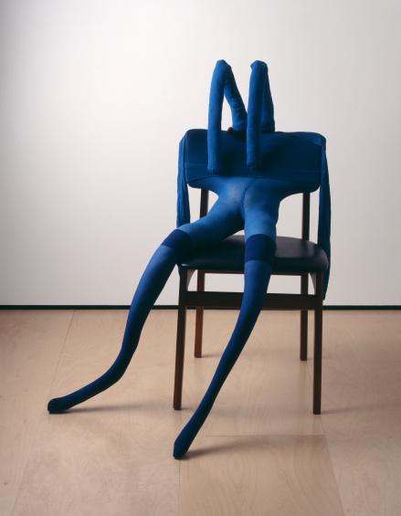 Sarah Lucas, Bunny Gets Snookered #8, 1997. Blue tights, navy stockings, vinyl and wood chair, clamp, kapok, and wire, 39 × 34 × 31 1/8 in (99 × 86.5 × 79 cm). © Sarah Lucas. Courtesy Sadie Coles HQ, London
