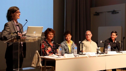 “We Who Feel Differently: A Symposium,” New Museum, May 2012. Left to right: Ann Pellegrini, Esben Esther Pirelli Benestad, Reina Gossett, Tiger Howard Devore, Julian Carter. Photo: Carlos Motta