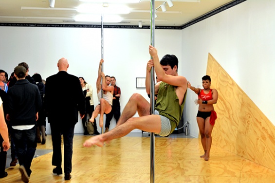 As part of Gerard & Kelly’s project on the Fifth Floor, and in conversation with the Fall 2014 R&D Season thematic CHOREOGRAPHY, the public is invited to observe and participate in pole-dancing classes, practice sessions, and on occasion, hosted events. These “Open Pole” gatherings will occur during “Pay-What-You-Wish” Thursday evenings from 7 to 9 p.m. at the New Museum. Pole classes by invitation only will be held from 7–8:30 p.m. Visitors are encouraged to observe. From 8:30–9 p.m., the artists open up the floor and invite visitors to practice their pole skills.