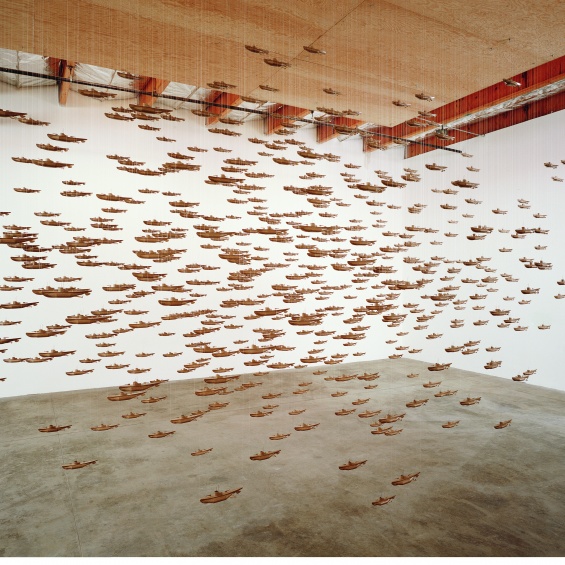Chris Burden, All the Submarines of the United States of America, 1987. 625 miniature cardboard submarines, 96 × 240 × 144 in (243.8 × 609 × 365.2 cm). Dallas Museum of Art purchase with funds donated by the Jolesch Acquisition Fund, The 500 Inc., the National Endowment for the Arts, Bradbury Dyer, III, Mr. and Mrs. Bryant M. Hanley, Jr., Mr. and Mrs. Michael C. Mewhinney, Deedie and Rusty Rose, and Mr. and Mrs. William T. Solomon