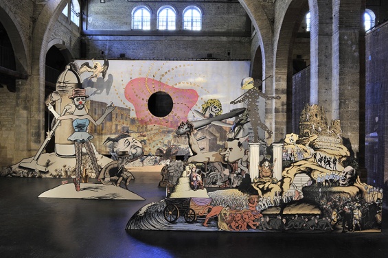 Jim Shaw, Labyrinth: I Dreamt I was Taller than Jonathan Borofsky, 2009. Installation comprising acrylic on muslin stretched over plywood panels, dimensions variable. Private collection, Brussels, Belgium. Image courtesy the artist and Galerie Praz-Delavallade, Paris. Photo © F. Deval, Mairie de Bordeaux
