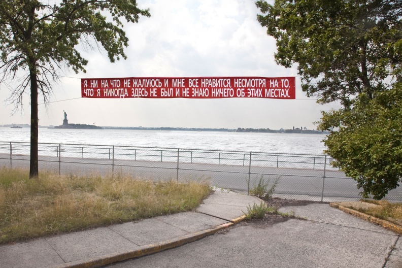 For “Ostalgia,” the New Museum re-presented Andrei Monastyrski’s work Slogan (1977) on an isolated location on Governors Island from July 14–September 25, 2011. The work consists of a red and white banner, which carries the message in Russian: “I DO NOT COMPLAIN ABOUT ANYTHING AND I ALMOST LIKE IT HERE, ALTHOUGH I HAVE NEVER BEEN HERE BEFORE AND KNOW NOTHING ABOUT THIS PLACE.” Facing the Statue of Liberty, the banner turns into a moving commentary on the history of displacement and relocation that characterizes New York’s harbor. This installation of the work maintains the sense of hermetic discovery inherent in Monastyrski’s original actions while allowing the message to reverberate to an entirely new audience.