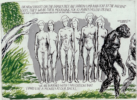 Raymond Pettibon, No Title (The new shoots), 2003. Pen and ink on paper, 18 7/8 × 24 1/2 × 1 1/2 in (47.8 × 62.4 × 3.8 cm). Courtesy Sadie Coles HQ, London