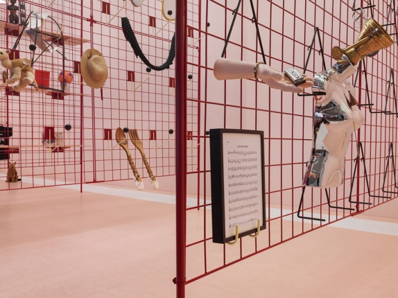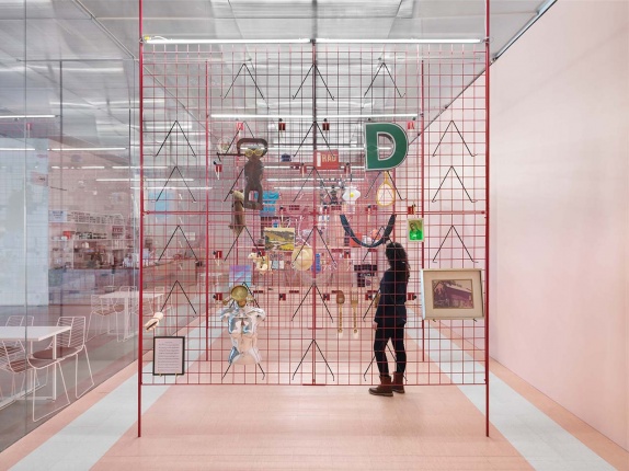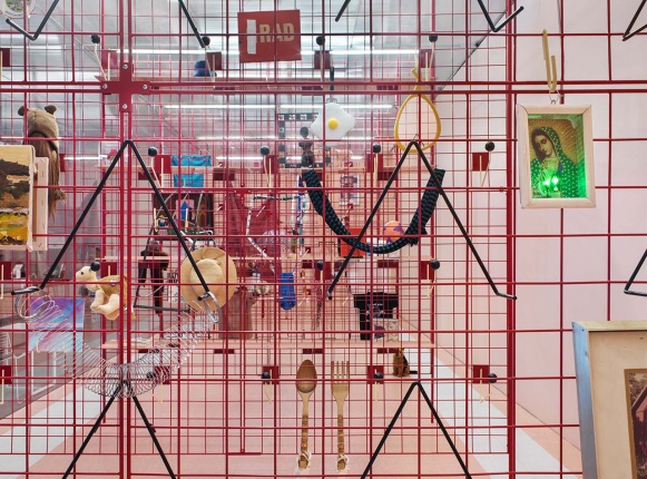 The title of the exhibition refers to the potlatch, a ceremonial gift-giving festival practiced by the Native-American peoples of the Pacific Northwest coast, for whom it continues to be a system of wealth redistribution. Camil invites the public to participate in the ongoing creation of her piece on designated days, during which visitors are encouraged to exchange their own unique items for others in the installation. The composition on the gridwall panels is thereby in flux and is repeatedly altered throughout the course of the exhibition. With “A Pot for a Latch,” Camil transforms the Lobby Gallery into a shop of sorts, in which the monetary value of an object is supplanted by its personal history and significance.