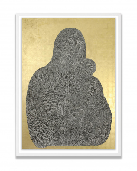 Thomas Bayrle, Madonna d’oro [Golden Madonna], 1988. Photocopy collage and gold leaf on wood, 78 × 57 1/2 in (198 × 146 cm). Photo: Wolfgang Gunzel