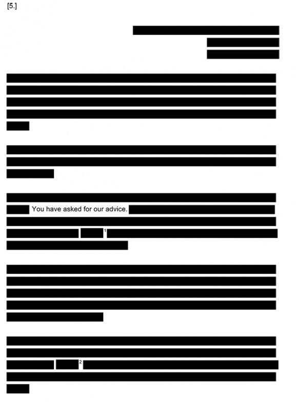 “You have asked for our advice.” The sentence occurs three paragraphs down. The rest of the page is redacted. All the reverse of the page reveals is the imprint of the solid blocks in which the sentence swims. Were there ever words here? Or is the redaction, precisely, the advice?