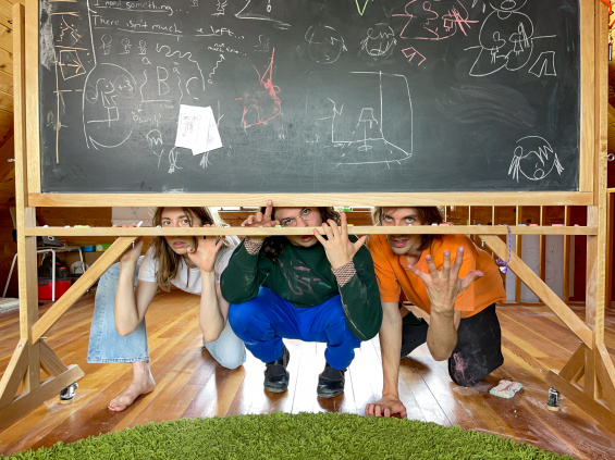 Whistlegraph (Alex Freundlich, Camille Klein, and Jeffrey Scudder) pose underneath a blackboard with chalk drawings. Courtesy Whistlegraph
