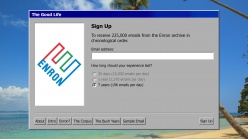 “ The Good Life invites you to experience a nightmarish simulation of living through the death throes of a corporation in the 2000s. Sign up at http://enron.email to receive 225,000 Enron emails over the course of seven years. You will receive the emails in chronological order at the frequency at which they were sent, relatively adjusted to the seven-year timeline.”