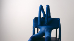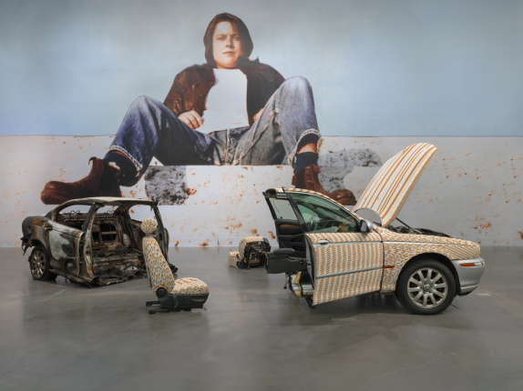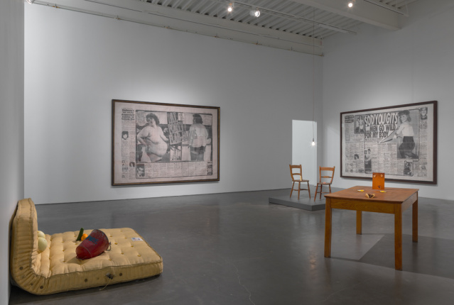 “Sarah Lucas: Au Naturel” features some of Lucas’s most important projects, including early sculptures from the 1990s that substitute domestic furniture for body parts and enlarged spreads from tabloid newspapers from the same period, which reflect objectified representations of the female body. Alongside the photographic self-portraits that Lucas has produced throughout her career, the exhibition features biomorphic sculptures including her stuffed-stocking Bunnies (1997–ongoing) and NUDS (2009–ongoing), the Penetralia series (2008–ongoing), and selections from her installations at the Freud Museum in London (2000) and the British Pavilion at the Venice Biennale (2015). These works, which complicate inscribed codes of sexual and social normativity, have never before been shown together in the US. Lucas has also created new sculptural works for the exhibition, including This Jaguar’s Going to Heaven (2018), a severed 2003 Jaguar X-Type—the car’s back half burned and its front half collaged with cigarettes—and VOX POP DORIS (2018), a pair of eleven-foot-tall thigh-high platform boots cast in concrete.
