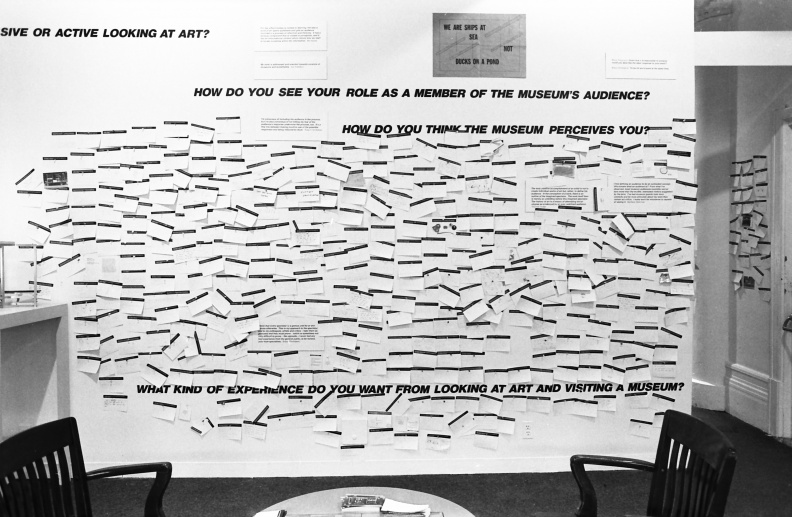 “Talking Back: The Audience in Dialogue,” a recent exhibition organized by Johanna Burton and Tara Hart in the Museum’s Resource Center, presented select materials from the Museum’s history that highlight the various ways in which artworks and projects have engaged the voice of the Museum’s audience. One project revisited was “Rhetorical Image Resource Room,” which was organized by artist, theorist, and educator Julie Ault and Susan Cahan, then Education Curator. During the run of the exhibition in 1990–91, visitors were invited to answer questions about their critical and interpretative processes as audiences of the Museum. The resulting four thousand response cards were displayed on the gallery. Read the catalogue on the New Museum Digital Archive here. →